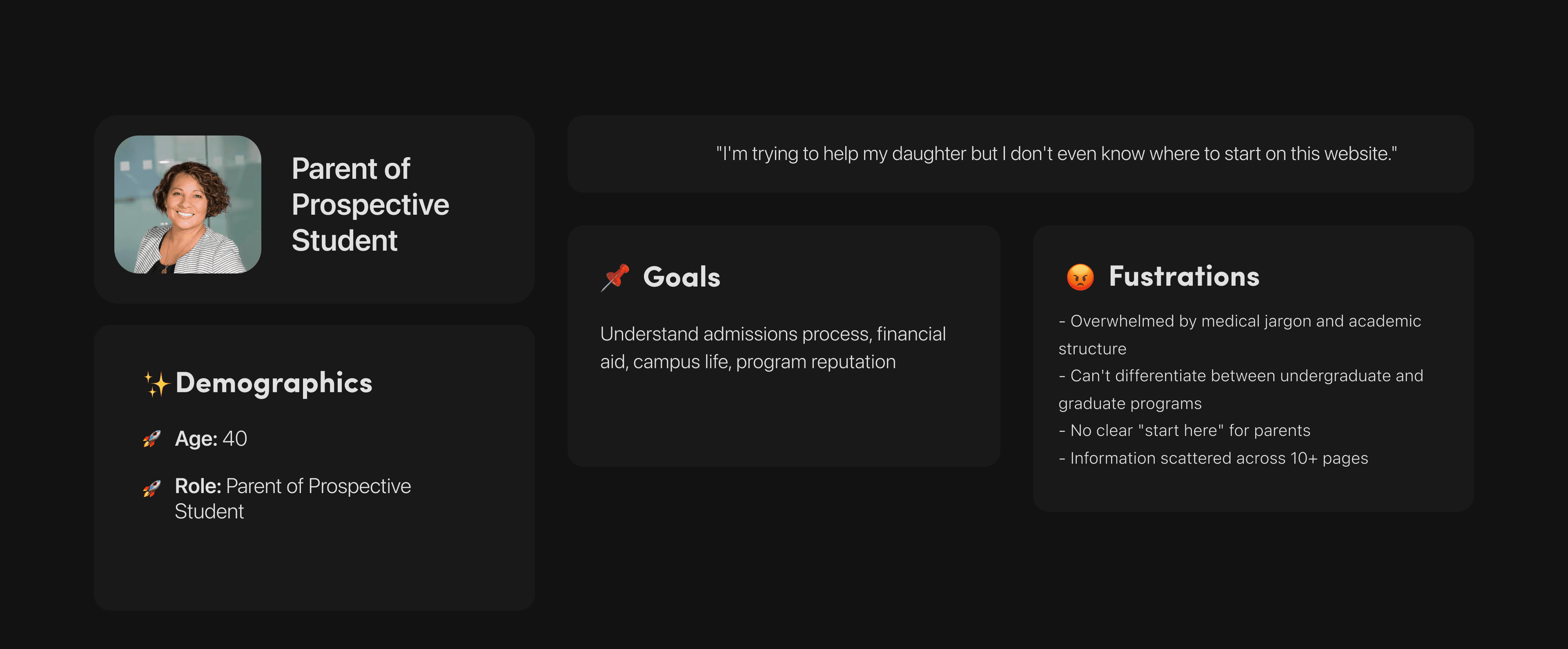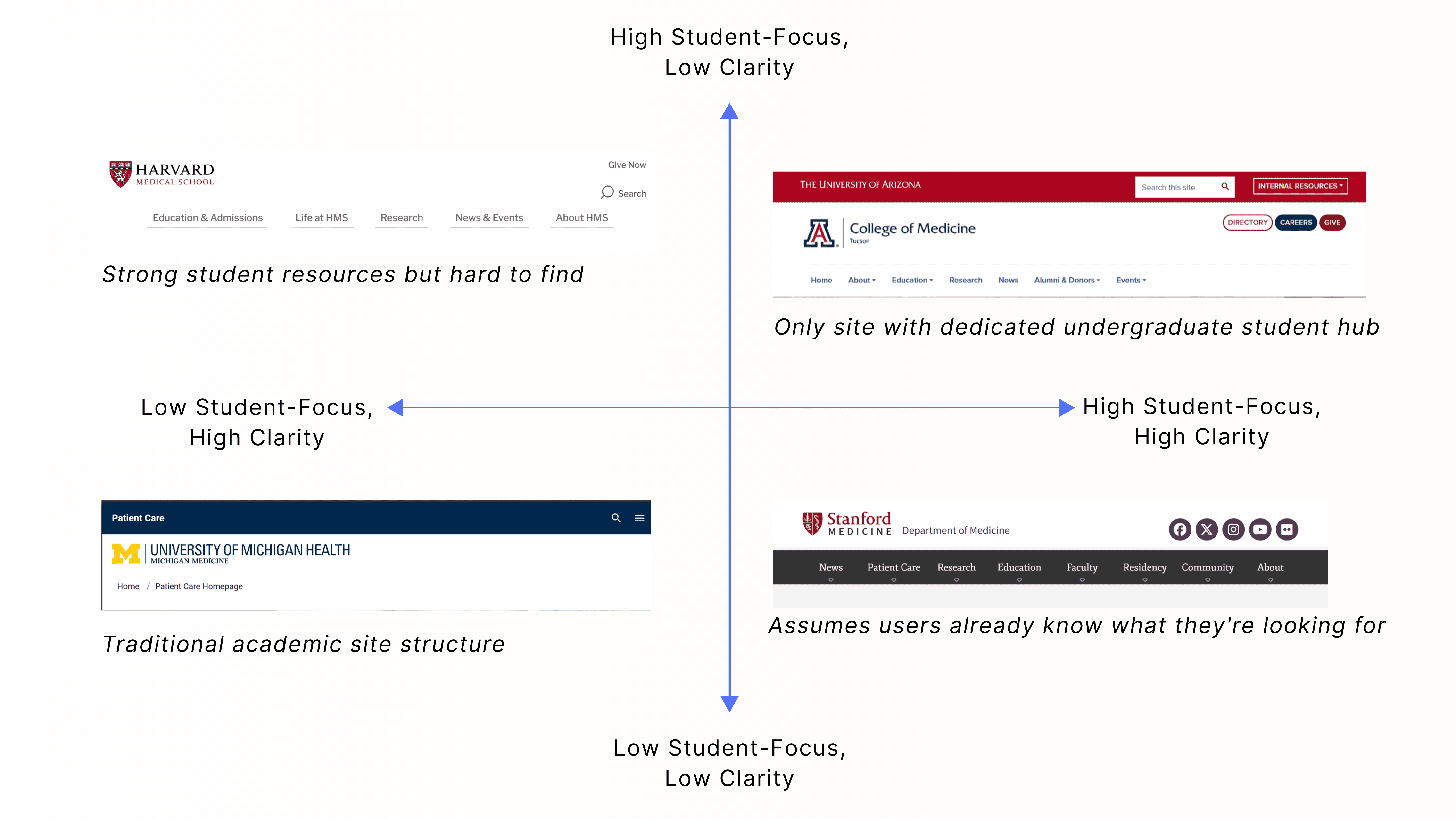 Gap identified: Most medical school sites prioritized research/prestige over student/parent usability. Opportunity to differentiate by being genuinely user-friendly.